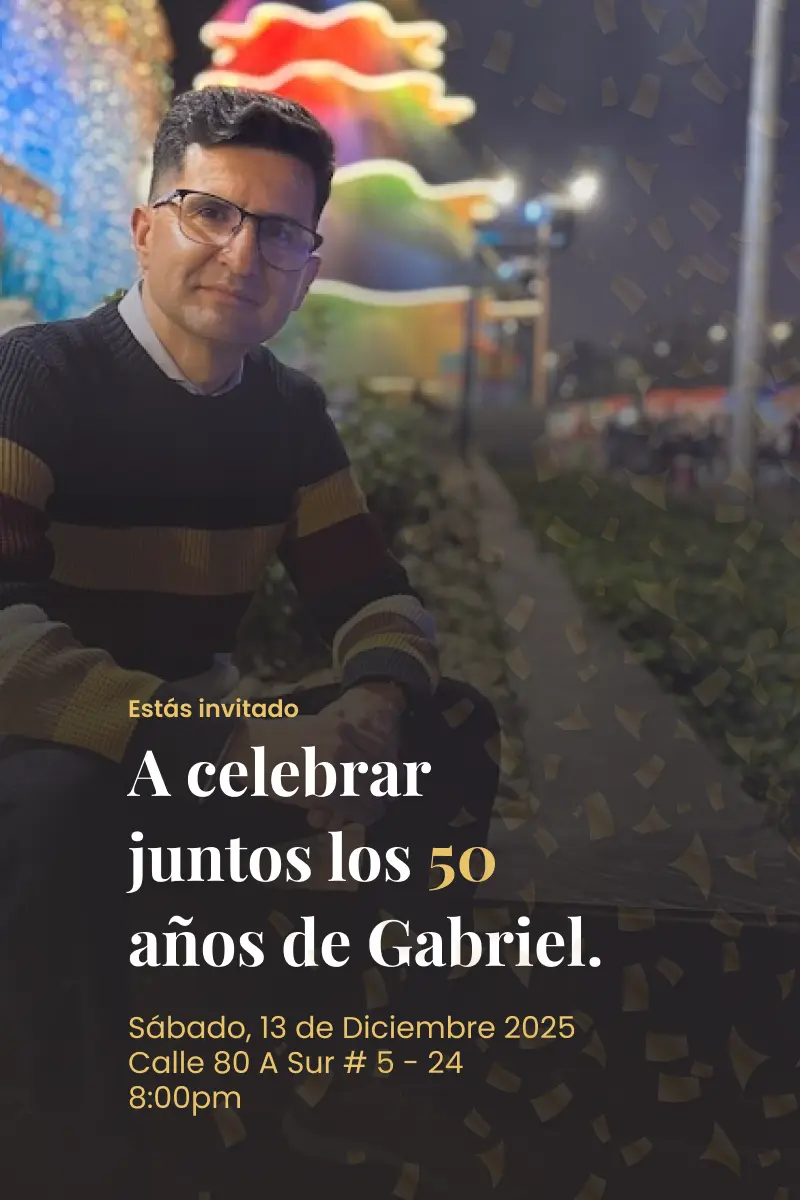 Celebremos juntos los 50 años de Gabriel, una vida llena de experiencias, afectos, proyectos y sonrisas que han construido la persona admirable que hoy es. Que esta noche sea un homenaje a su historia y a los momentos extraordinarios que todavía tiene por vivir.